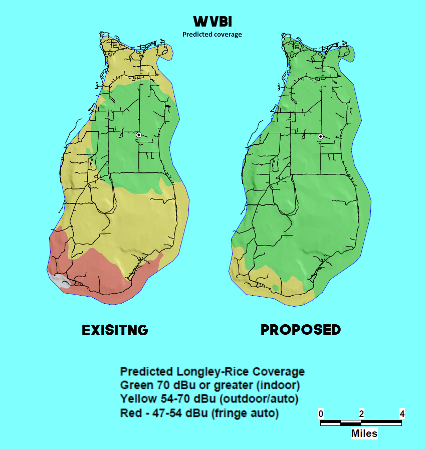 PABI is the licensee of WVBI-LP, Beaver Island. The current predicted coverage area of WVBI and the proposed predicted coverage area for the new station are shown in the map below. If the application is granted, PABI will divest its interest in the current authorization and transfer the operations of WVBI (and its call sign) to the new station.