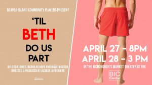 Have you made your reservations for the Beaver Island Community Players production of ’til Beth Do Us Part? You can see the show Saturday, April 27 at 8pm or Sunday, April 28 at 3pm. Tickets are available at the BIC Center Front Desk or you can cal 231-448-2022 to make your reservations. Last year’s spring comedy was a near sellout, so don’t miss your chance to see this year’s show.