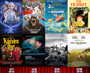 Pickleball on Tuesdays, Thursdays and Saturdays from 10 to noon, the Arthritis Foundation Exercise Program on Tuesdays and Fridays from 10:30 to 11:30 a.m., Games Galore on Thursdays from 1 to 4 p.m. and movies every Saturday with shows at 4 and 7 p.m. For the last week of Feruary, we conclude our Holly Classic Matinee month with Breakfast at Tiffany’s at 4. Then, at 7 it’s the award winning film The Nightingale. Our March lineup is laid out in the adjoining grid of posters for each show.