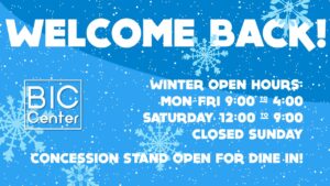 The BIC Center is resuming regular hours Monday, Feb 1st. We’ll be open from 9 to 4 weekdays and noon to the end of our 7:00 movie on Saturdays (usually around 9:00). Our concession stand will reopen as well with snacks, breakfast items, hot dogs, popcorn and pizza available.