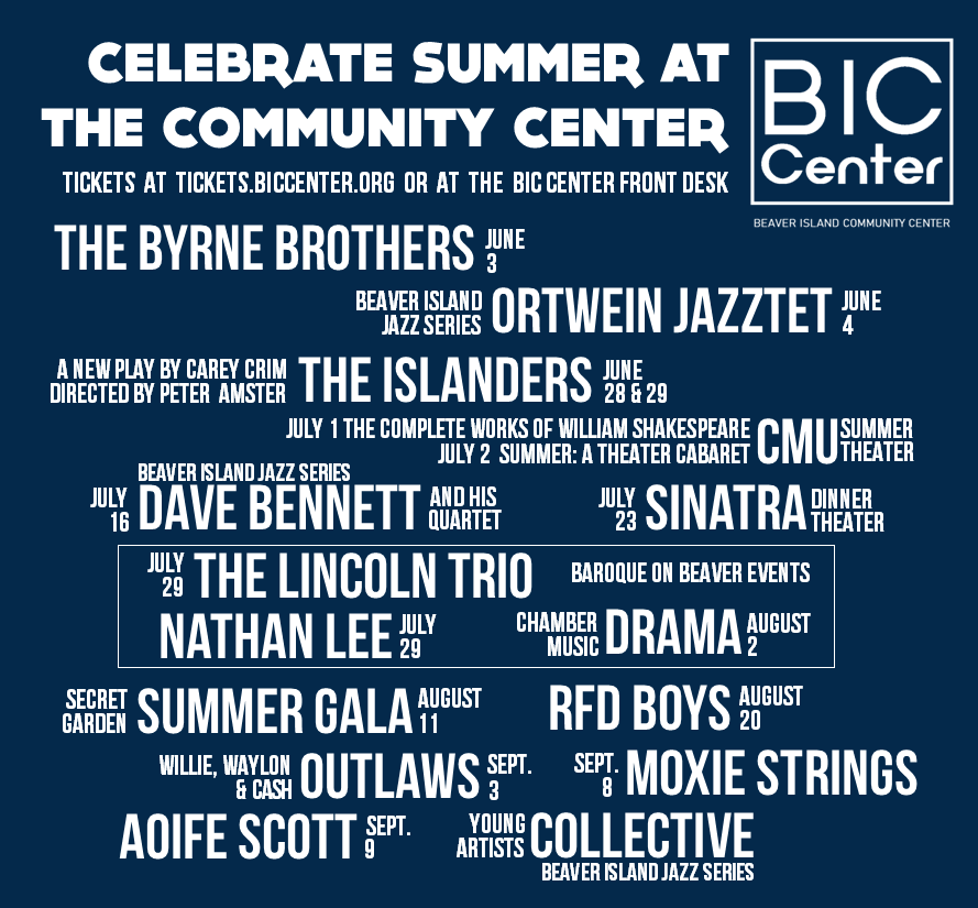 Next up is the CMU Summer Theater series with The Complete Works of William Shakespeare on July 1st and Summer: A Theater Cabaret on the 2nd. Curtain time both evenings is 7:30. July events continue with island favorite Dave Bennett on July 16th.  He’ll be here with his quartet. Showtime is 7:00 p.m. The following weekend we’ll present a special dinner theater event featuring the music of Frank Sinatra. Baroque on Beaver kicks off the weekend after that with two Gala events that are fundraisers for the Beaver Island Performing Arts Alliance. The Lincoln Trio is up first on the 29th and then pianist Nathan Lee takes the stage on the 30th. Showtime for both is 7:30.